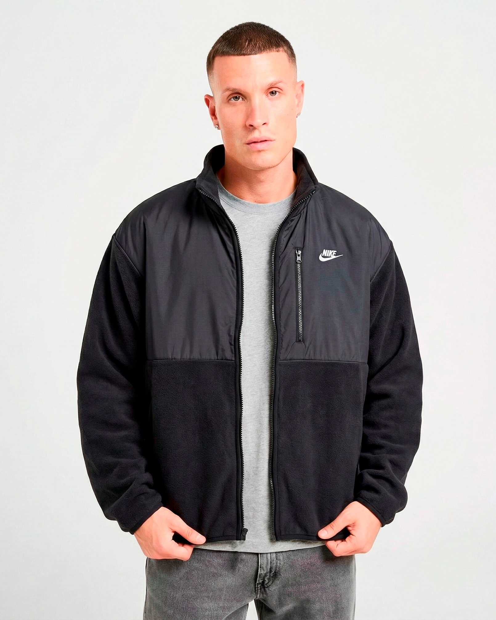 We took the comfort of a fleece jacket and added Therma-FIT tech and woven, water-repellent overlays in some areas to help provide coverage from cold-weather elements.